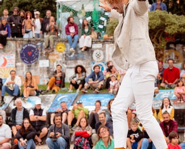En sus espectáculos podemos ver la fusión de diversos lenguajes: poesía, cuerda lisa, malabares, manipulación de objetos, teatro físico y danza.